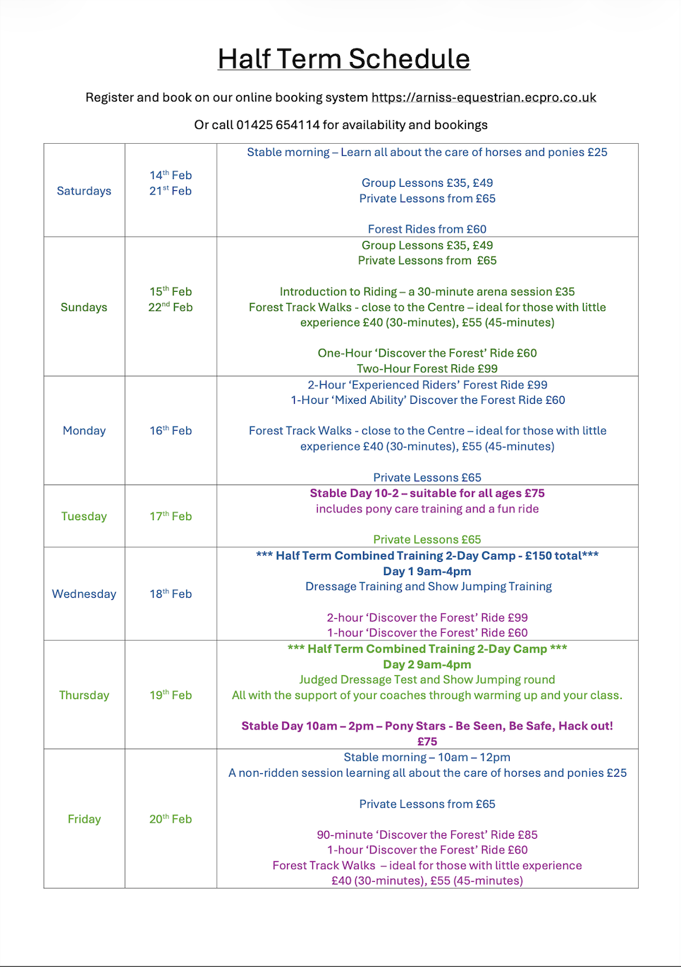• Half Term Activity Schedule